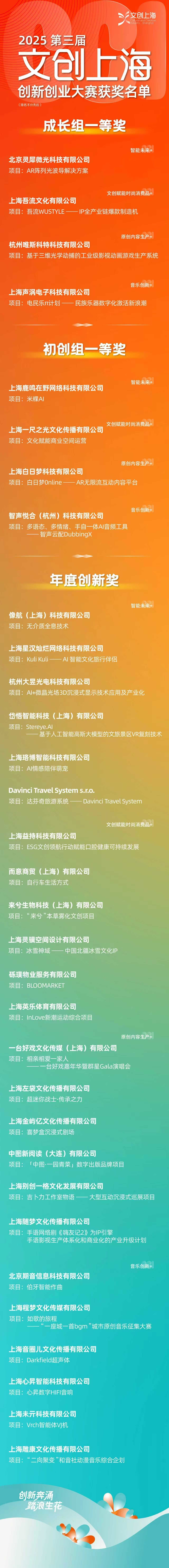 12月17日,第三届“文创上海”创新创业大赛颁奖典礼在上海图书馆东馆举行;同期,上海文化创意产业研究院正式宣告成立,将全方位助推文创产业生态建设与创新发展。本届大赛联合上海各区、文创园区、行业协会,并联动浙江、江苏、四川、澳门等全国20余个地区的文化机构,多渠道招募参赛项目,最终征集总数达1765个,较第二届增长近60%。鹿鸣在野、智声悦合、吾流文化、白日梦科技等8家企业的项目凭借其前瞻性与创新性,荣获一等奖。